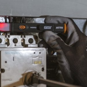 The HT Italia HT70 pen voltage detector permits both to quickly verify the presence of AC voltage on any type of electrical installation (sockets, cables, fuses, switchboards, etc.) with and without direct contact and also to perform phase sequence indication and conformity test on generic three phase plants by using red and green fixed and blinking LED indications. HT Italia HT70 is designed according to IEC/EN61010-1 safety standard in CAT IV 1000V.